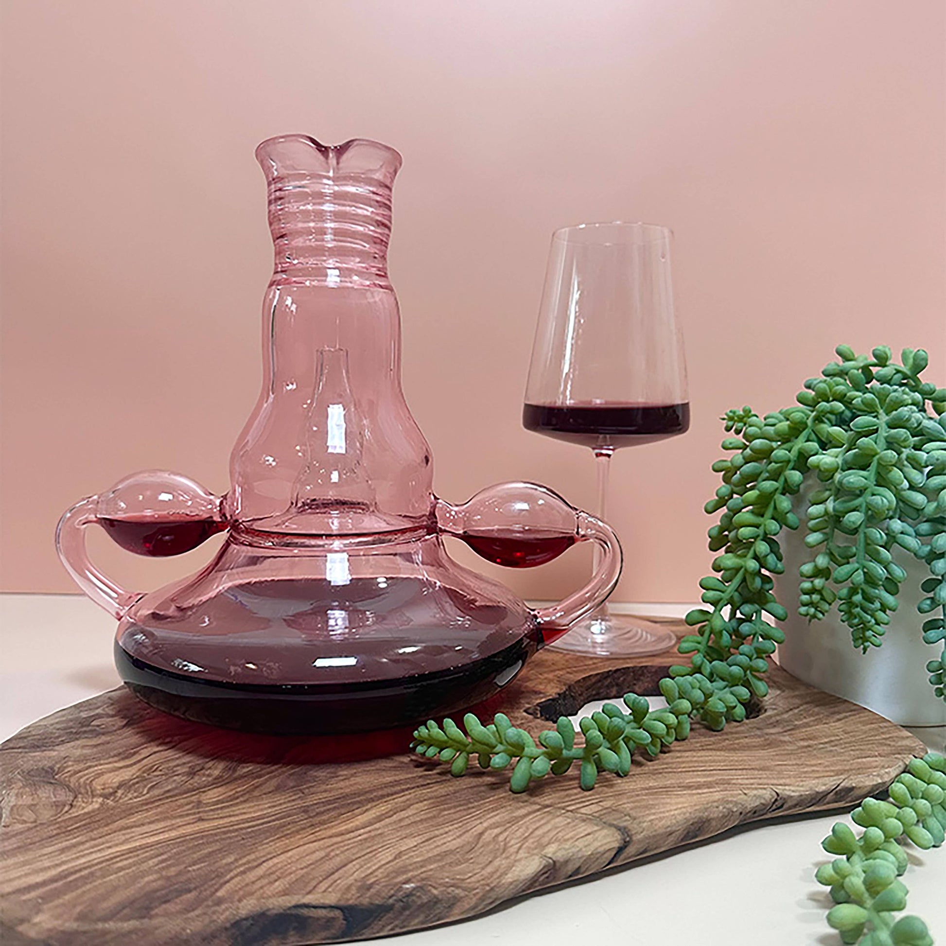 This isn’t just a wine decanter. It’s a sacred vessel dressed in rose-tinted rebellion, hand-blown into the shape of a uterus because the divine feminine deserves more than dusty shelves and quiet corners. It aerates wine like a ritual—pouring in through the ovaries, flowing through the fallopian tubes, resting in the womb, and finally releasing through the cervix like a full-bodied exhale you didn’t know you were holding.